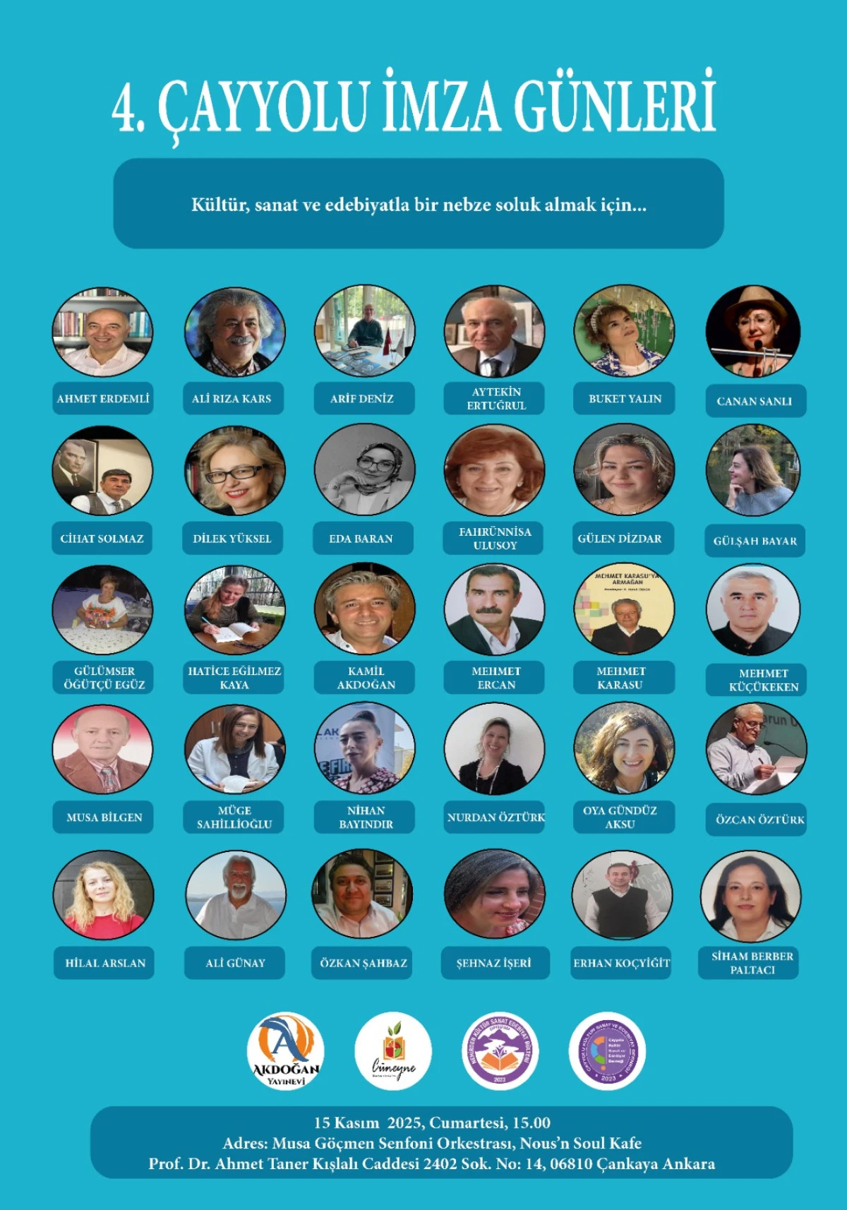 Yazarımız Özcan Öztürk’ün eserlerinin de yer aldığı 4. Çayyolu İmza Günleri 15 Kasım Cumartesi günü saat 15.00 de Prof. Dr. Ahmet Taner Kışlalı Caddesi 2402 .Sokak No. 14 Çankaya adresindeki Musa Göçmen Senfoni Orkestrası , Nous’n Soul Kafe’de gerçekleştirilecektir.