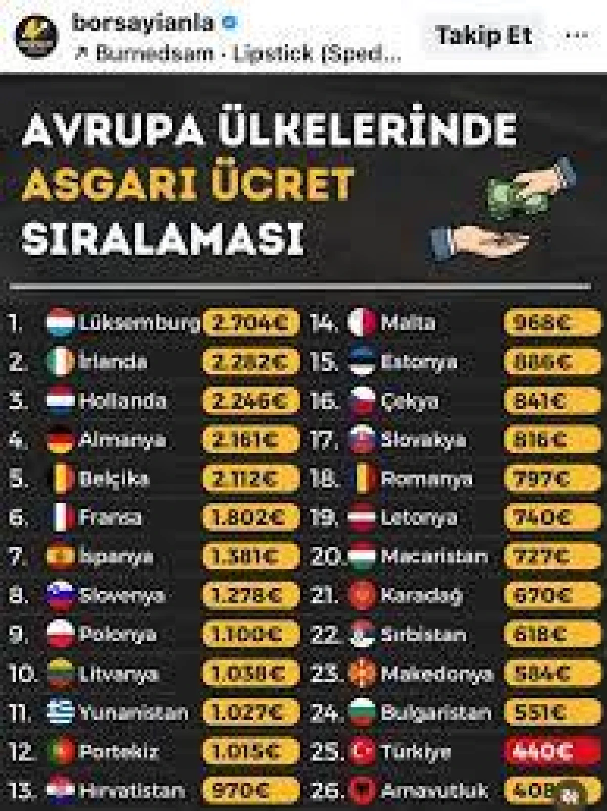Beş ülkede asgari ücret 2 bin euronun üzerinde. Lüksemburg’un yanı sıra bunlar İrlanda (2 bin 391 euro – yaklaşık 122 bin 897 TL), Almanya (2 bin 343 euro – yaklaşık 120 bin 430 TL), Hollanda (2 bin 295 euro – yaklaşık 117 bin 963 TL) ve Belçika (2 bin 112 euro – yaklaşık 108 bin 557 TL).