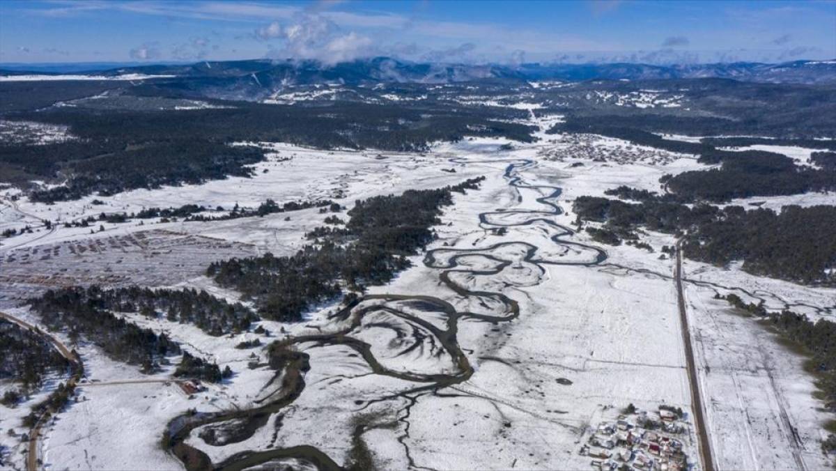 Bu arada, beyaz örtüyle kaplanan yayla ile menderesler havadan görüntülendi.