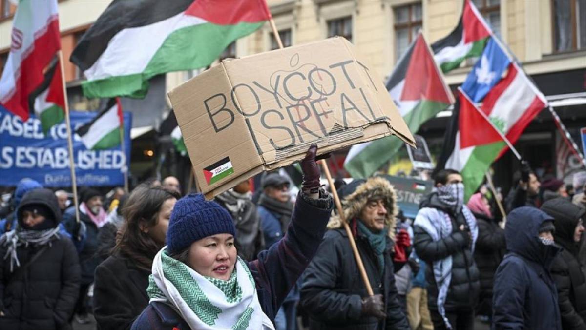 Göstericiler, "Siyonizm suçtur", "Filistin’e özgürlük" ve "Gazze zor durumda, orada binlerce çocuk üşüyor" şeklinde sloganlar attı.