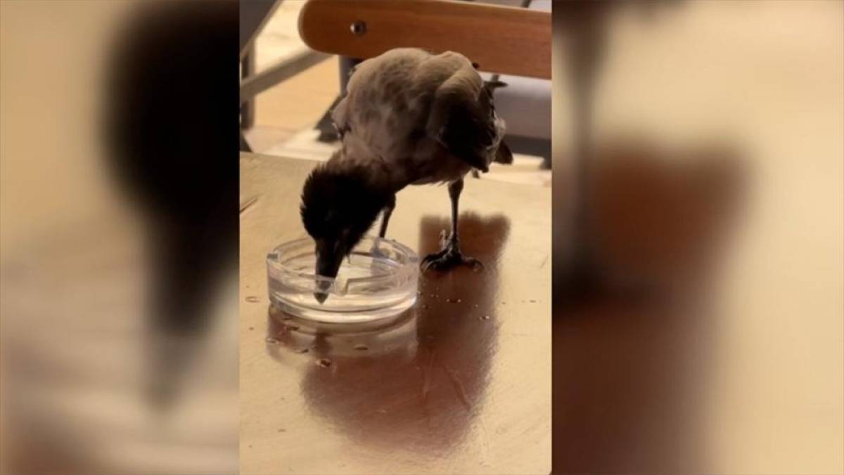 Muğla'nın Bodrum ilçesinde sıcaktan etkilenen karga, girdiği kafede masaya bırakılan suyu içti ve verilen yiyecekleri yedi.