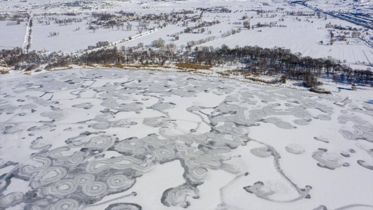 Yüzeyi buz tutan göl, havadan görüntülendi.