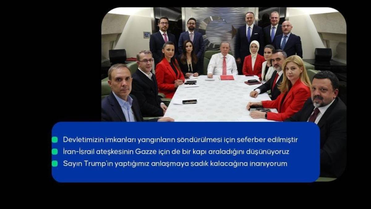 "Gazze'nin kaybedecek vakti yok"Cumhurbaşkanı Erdoğan, bir basın mensubunun, İran'daki ateşkes sonrasında gözlerin Gazze'ye çevrildiğini ve burada da bir ateşkesin beklendiğini belirterek, özellikle ABD'nin İsrail'i ateşkese zorlayıcı adımlar atmasının beklenip beklenmediği sorusu üzerine, "Gazze'nin kaybedecek vakti yok, Gazze'de insanlık can çekişiyor. İnsanların açlığa mahkum edilmesinin, üzerlerine bombaların yağdırılmasının görmezden gelinmesi insanlıkla bağdaşmıyor. Bir an önce ateşkesin sağlanması ve insani yardımların oraya en etkin biçimde ulaştırılması için çabalıyoruz. Türkiye olarak diplomatik gayretlerimizi hiç kesmedik ve her muhatabımızla oradaki insani tablonun vahametini konuşuyoruz." ifadelerini kullandı.