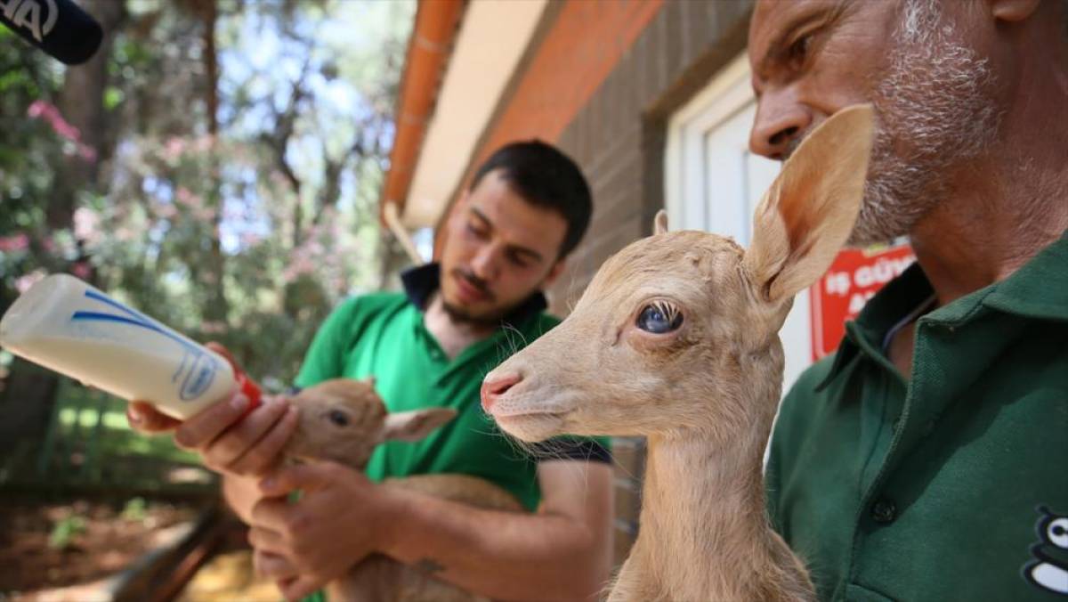 Prematüre olmaları nedeniyle bakımları da zor olan ikiz geyik yavrularının bakımını Gaziantep Doğal Yaşam Parkı'ndaki Hayvan Hastanesi'nde görevli veteriner hekim ve bakıcılar üstlendi.
