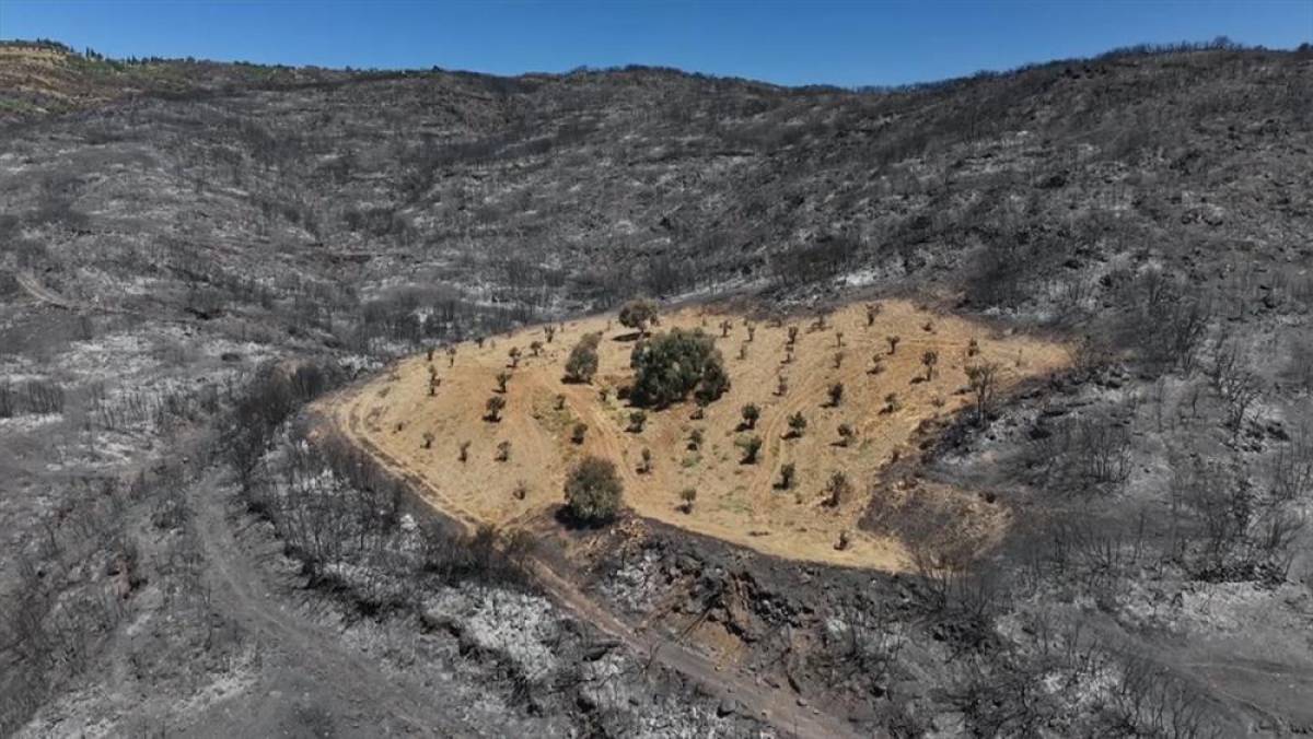 İzmir'in Ödemiş ilçesinde çıkan orman yangınında, çiftçi Ahmet Türk'ün daha önceden sürüp otlardan temizlediği bahçe, siyah örtüyle kaplanan bölgede yanmamış olmasıyla dikkati çekiyor.