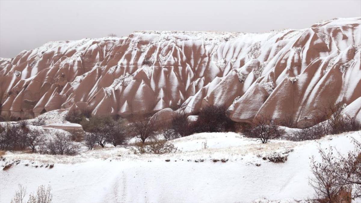 Türkiye'nin tarihi, kültürel ve doğal güzellikleriyle bezeli turizm bölgesi Kapadokya'da, mevsimin ilk karı peribacalarıyla kaplı vadilerde masalsı manzara oluşturdu.