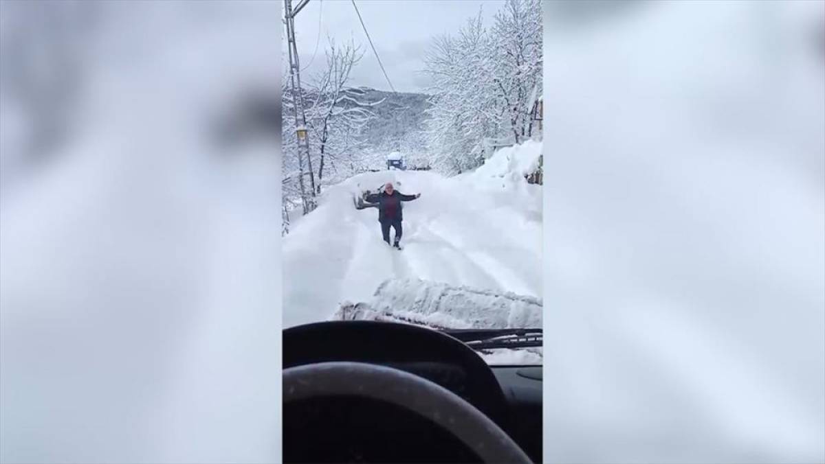 Kastamonu'nun Bozkurt ilçesinde kar nedeniyle yolu kapanan köy sakini, çalışma yapan ekibi oynayarak karşıladı.