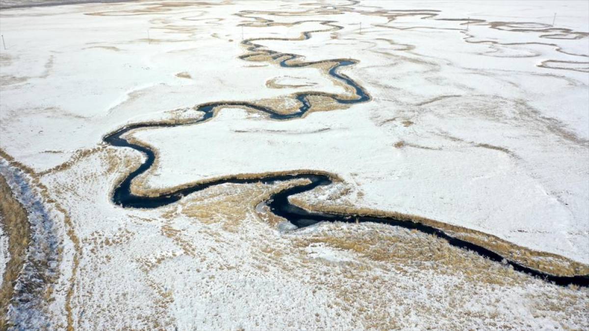 Karla beyaza bürünen Göle Ovası'ndaki menderesler dronla görüntülendi