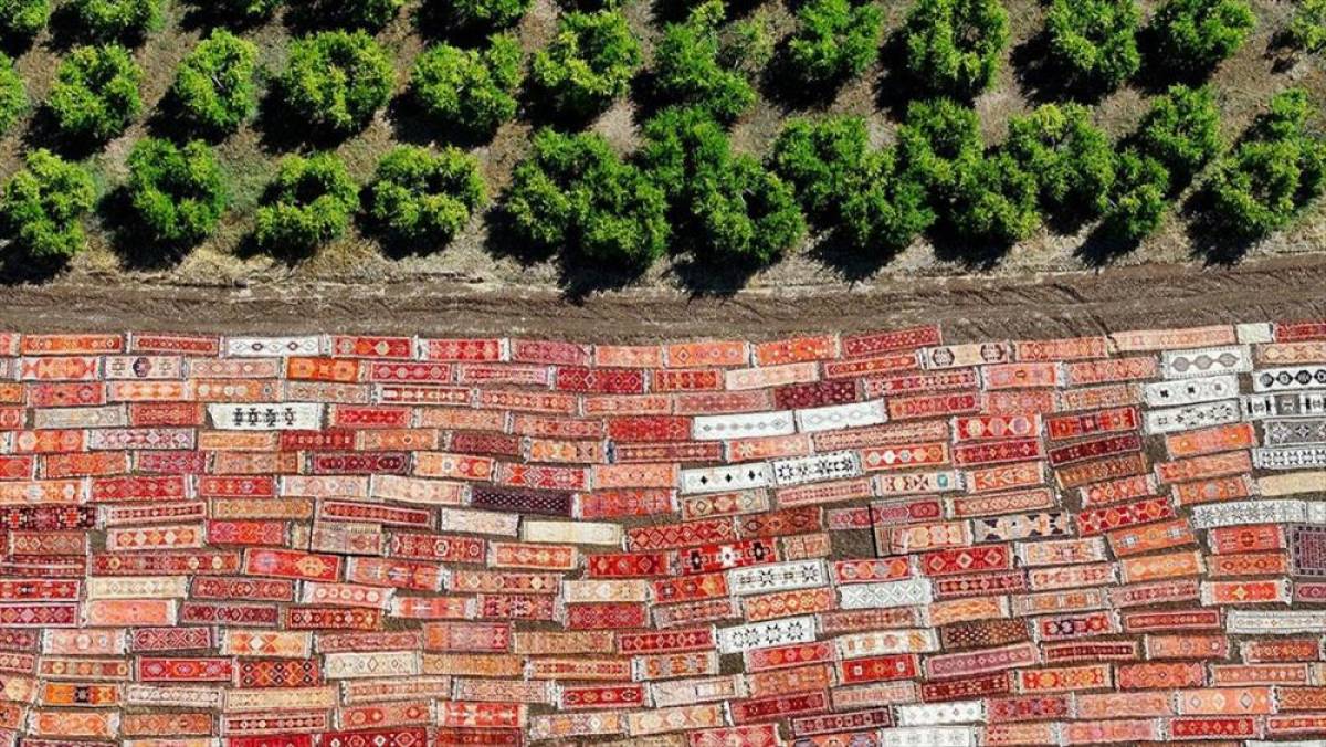 Türkiye'nin farklı illerinden toplanan kök boyalarıyla boyanmış, Yörük motifleri başta olmak üzere çeşit çeşit motifle bezenerek dokunmuş eski halı ve kilimler, tarlalara seriliyor.