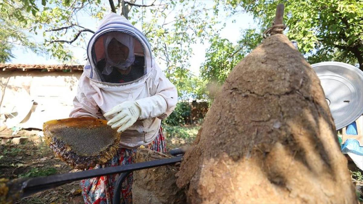 KIRKLARELİ (AA) - Kuştepe köyünde evinin bahçesinde konik sepetlerle bal üreten Gürses, bugünlerde yoğun bal mesaisine devam ediyor.