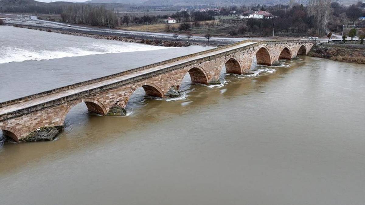 Kızılırmak'ın debisi yağışlar ve kar sularının etkisiyle yükselince Kayseri'nin Sarıoğlan ilçesindeki tarihi Şahruh Köprüsü'nün 8 kemeri suyla doldu.