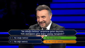Ünlü oyuncu ve sunucu Oktay Kaynarca'nın sunumu yayınlanan Kim Milyoner Olmak İster'in 15 Aralık günü ekrana gelen son bölümünde yarışmacıya 'Ne olduğu belirsiz anlamına gelen deyimin TDK sözlüğüne göre doğru yazılışı nedir?' diye soruldu.