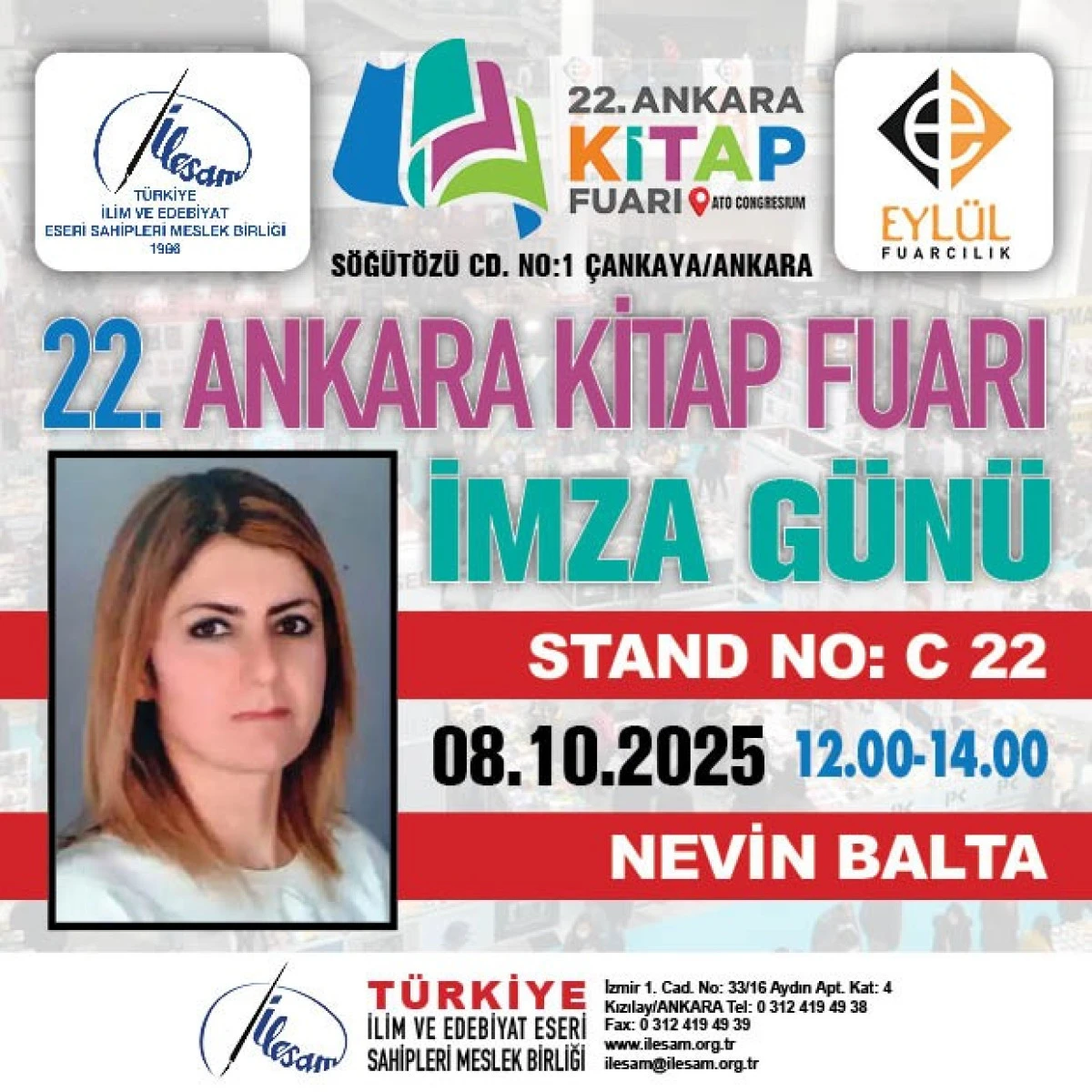 Yazarımız Nevin Balta, Türkiye İlim ve Edebiyat Eseri Sahipleri Meslek Birliği tarafından Congresium'da düzenlenen 22. Ankara Kitap Fuarı'nda kitaplarını imzalıyor.