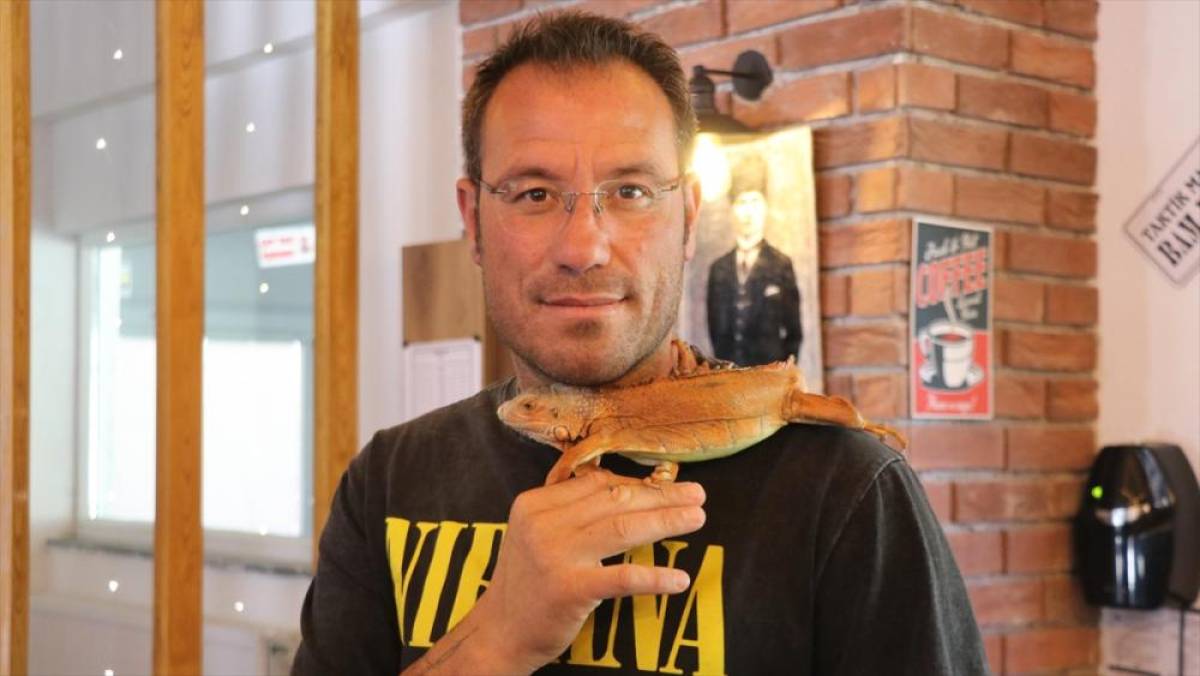 Yozgat'ın Sorgun ilçesine bağlı Bahadın beldesinde kafe işleten Güner Öztürk'ün, 1,5 yıl önce satın alarak "Ökkeş" adını verdiği iguana, müşterilerin ilgisini çekiyor.
