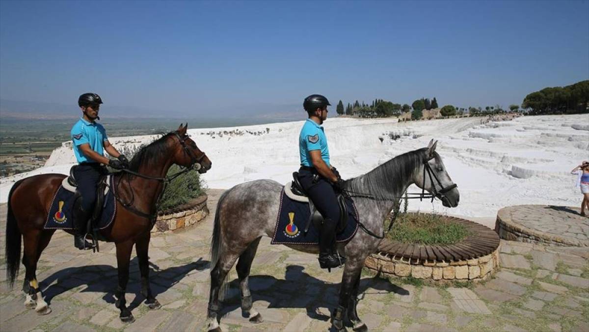 UNESCO Dünya Mirası Listesi'nde yer alan, Türkiye'nin önemli turizm merkezlerinden Pamukkale'de görevli atlı jandarma timi, turistlerin huzurlu ve güvenli vakit geçirmeleri için mesai harcıyor.