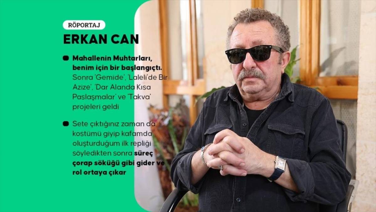 Tiyatro sahnesinden sinema perdesine uzanan kariyerinde canlandırdığı güçlü ve sıra dışı karakterlerle Türk sinemasının önemli isimlerinden oyuncu Erkan Can, "Ben kamera karşısında oynamayı Mahallenin Muhtarları'nda öğrendim." dedi.