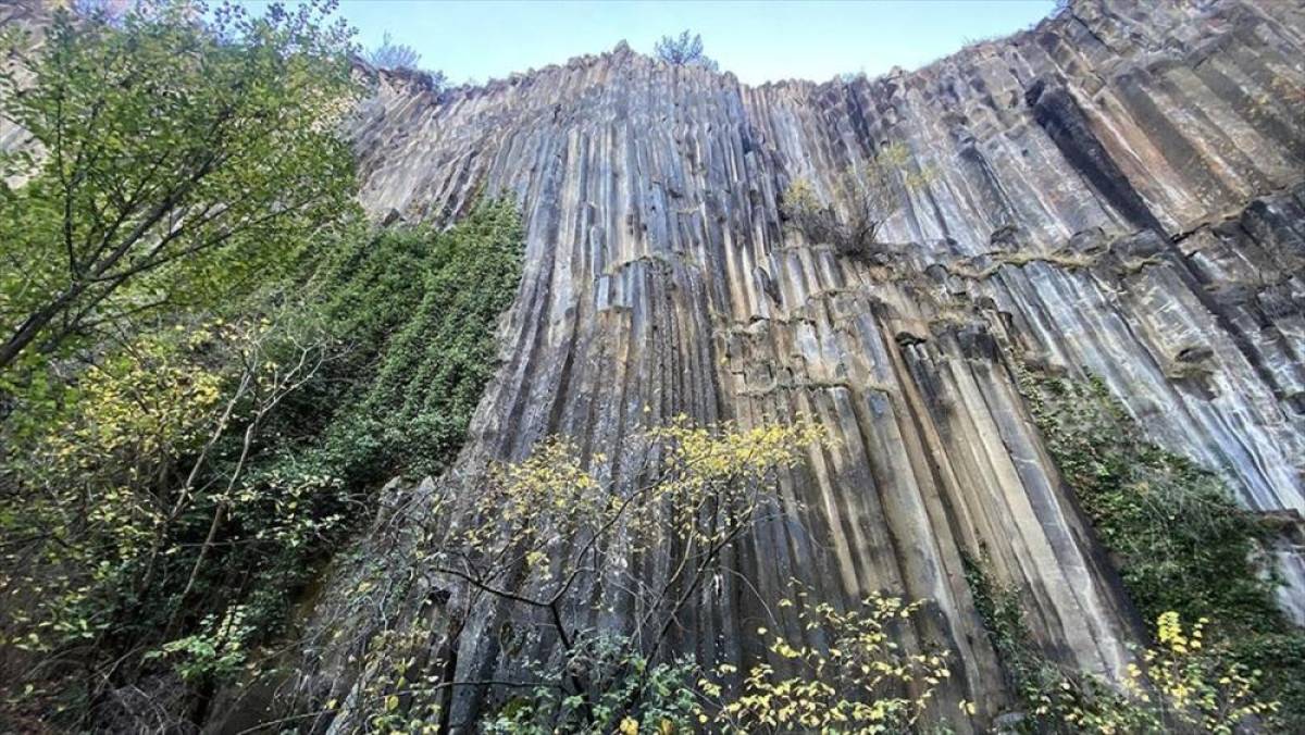 Sinop'un Boyabat ilçesi Kurusaray köyünde volkanik patlama sonucu yaklaşık 5 milyon yıl önce oluştuğu tahmin edilen bazalt kayalıkları, ziyaretçilerini sonbahar renkleriyle karşılıyor.