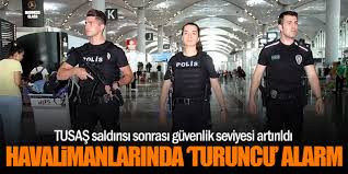 Türk Havacılık ve Uzay Sanayi'ne (TUSAŞ) yapılan terör saldırısının ardından başta İstanbul ve Sabiha Gökçen Havalimanı olmak üzere Türkiye'deki tüm havalimanlarında olası terör saldırılarına ilişkin turuncu alarm verildi.