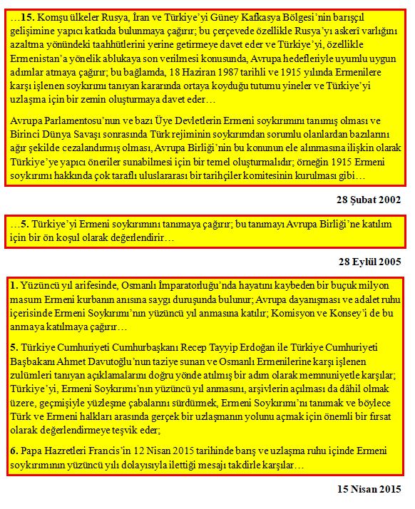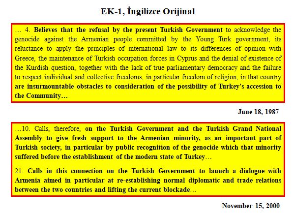‘Türkiye’nin Ermeni soykırımını tanıması çağrısında bulunur ve bu tanımayı Avrupa Birliği’ne üyelik için bir ön koşul olarak görür…’ (AP Kararı 28 Eylül 2005 bkz. EK-1)